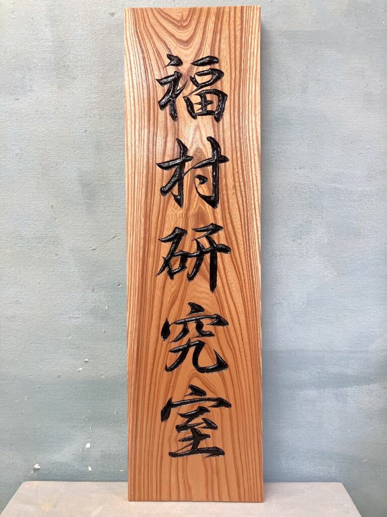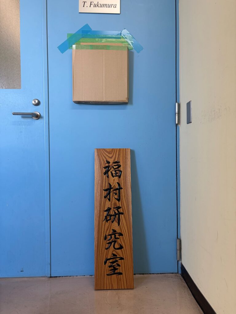 記念品として教授にお渡ししたところ、とても喜んでいただき、研究室としても良い記念になりました。現在は教授室の出入口に立て掛けており、木の温かみのある看板のおかげで、部屋の雰囲気や存在感がより一層引き立っているように感じています。