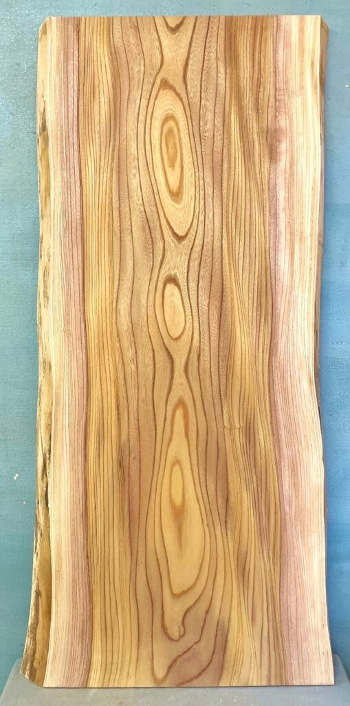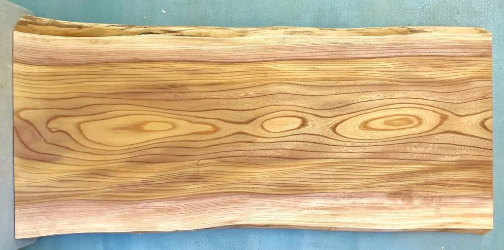 ■木目と色合いがきれいなケヤキの4辺直線カット板材です。厚みがやや薄いため、価格を抑えています。下画像のように縦長で使うこともできます。