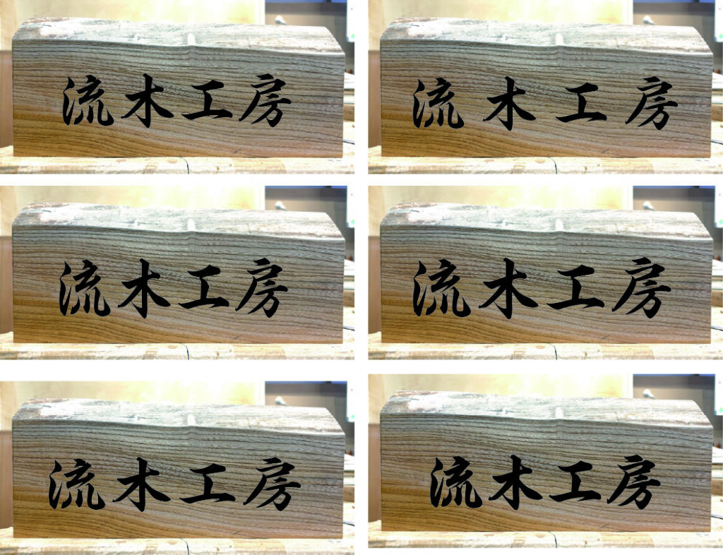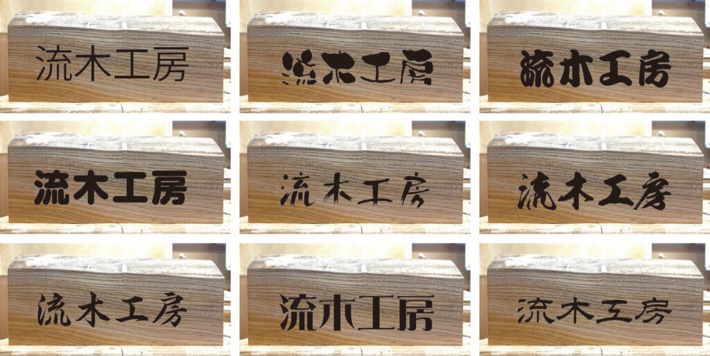 画像のように、同じ文字でも、フォントでイメージは大きく変わります。縦向きか横向きか、二列か一列か等、様々なパターンが考えられます。実際に製作する木材の上にイメージ画像を作成しますので、お客様にも、完成図をイメージしていただきやすいかなと思っています。
