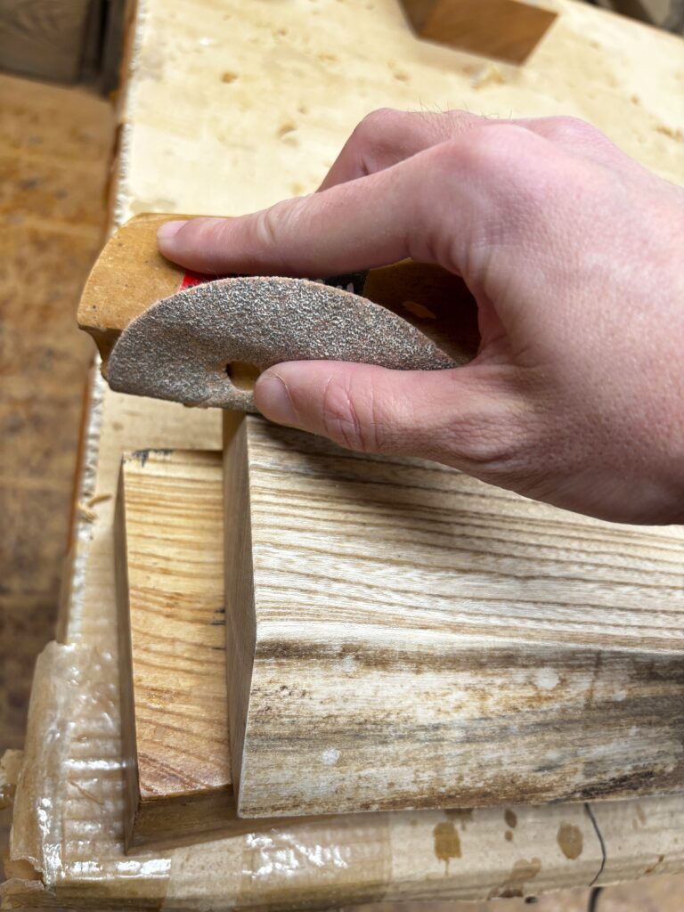 そして次に、研磨です。木材業者から仕入れた時点で、ある程度木材は研磨してありますが、看板製作の際に改めて研磨します。番手が粗いものから細かいもので削り、表面を滑らかにします。角をほんの少し丸め、ミミの部分も、自然の風合いを損なわない程度に削ります。